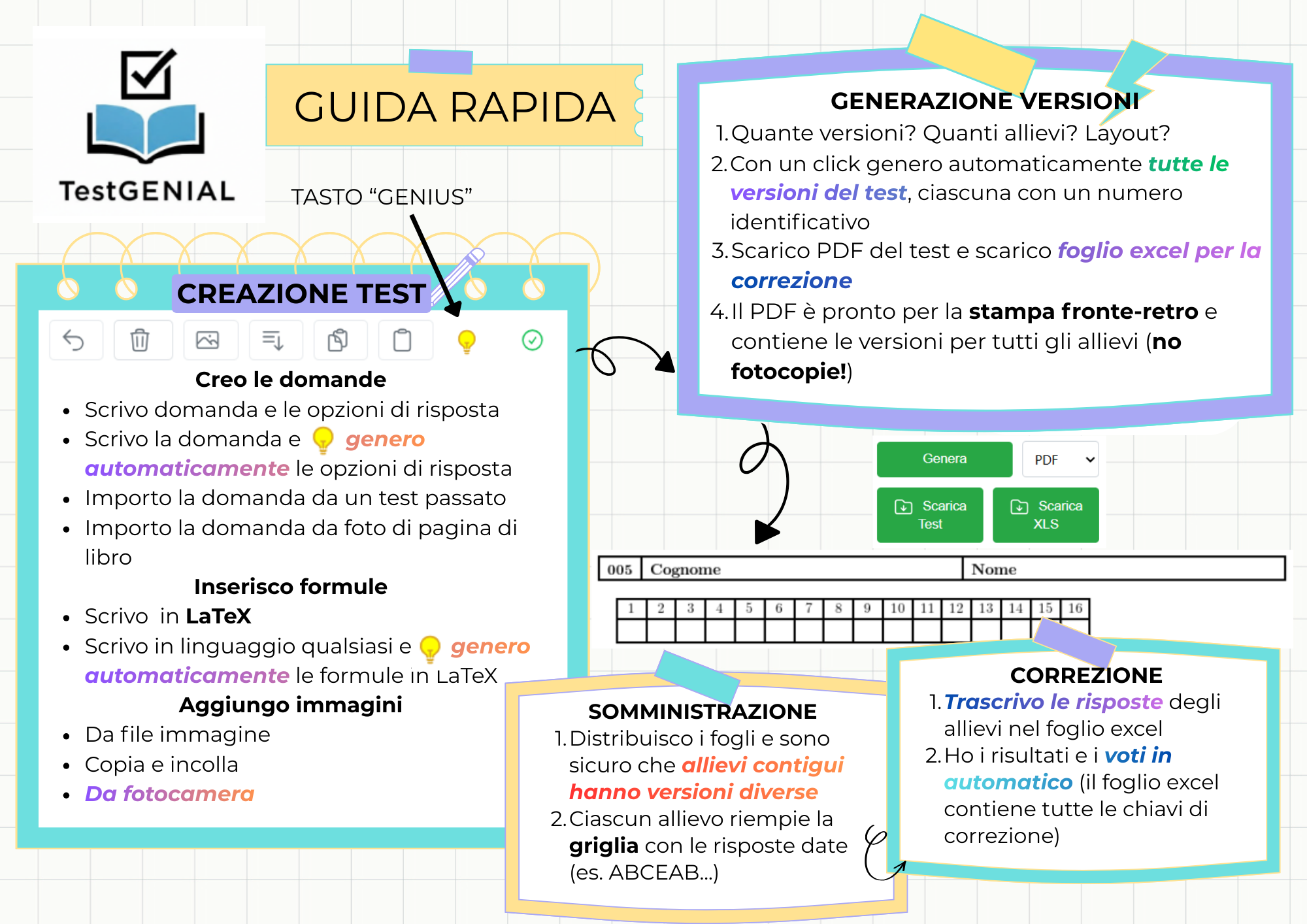 0% Burocrate Genera varianti rimescolate in un unico PDF e un foglio di calcolo per la correzione automatica.